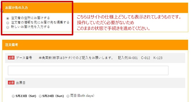 ご注文いただいた備品は全てビッグサイト内・お客様のブースへお届け致しますのでご安心ください。 防炎布は受付カウンターでのお渡しとなります。